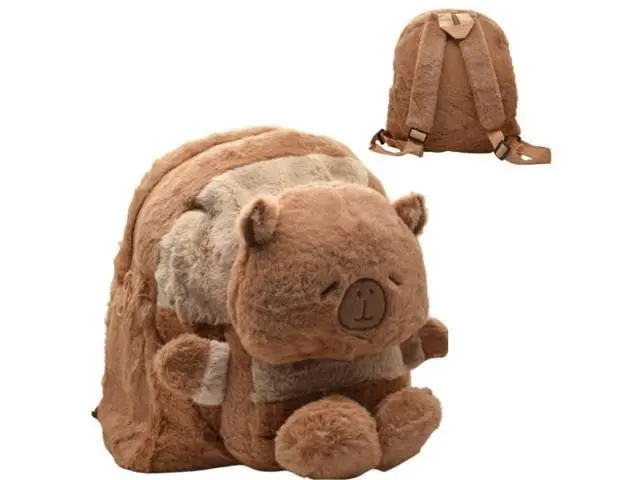 Mochila de felpa con carpibara.Medidas: 30x26cm.Material: poliéster. Color: marrón.Diseño: carpibara.
